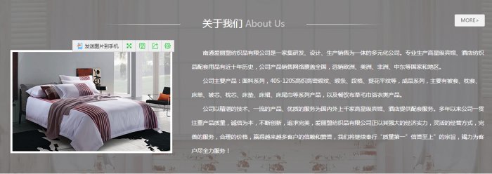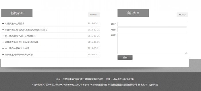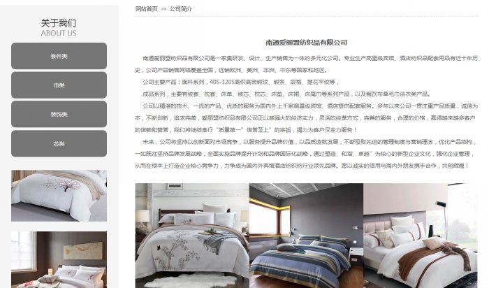 南通愛麗盟紡織品有限公司是一家集研發、設計、生產銷售為一體的多元化公司。專業生產高星級賓館、酒店紡織品配套用品有近十年歷史,公司產品銷售網絡覆蓋全國,遠銷歐洲、美洲、非洲、中東等國家和地區。公司主要產品:面料系列,40S-120S高織高密緞紋、緞條、段格、提花平紋等,成品系列,主要有被套、枕套、床單、被芯、枕芯、床墊、床裙、床尾巾等系列產品,以及餐飲布草毛巾浴衣類產品。